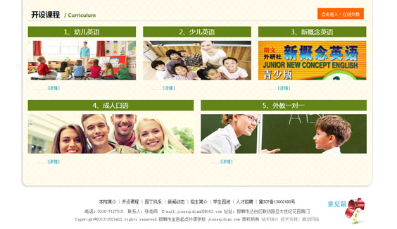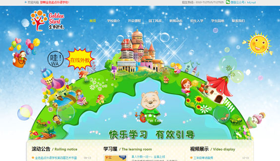 負(fù)責(zé)邯鄲市金色起點(diǎn)外語學(xué)校網(wǎng)站設(shè)計(jì)制作開發(fā)等網(wǎng)站建設(shè)服務(wù),金色起點(diǎn)是一所面向兒童的外語高級培訓(xùn)學(xué)校,故網(wǎng)站設(shè)計(jì)時(shí)注重活潑、可愛、時(shí)尚等特點(diǎn),金色起點(diǎn)網(wǎng)站設(shè)計(jì)以藍(lán)色為主打系,黃色為輔助色系,采用先進(jìn)的動(dòng)態(tài)flash技術(shù)使整個(gè)網(wǎng)站生動(dòng)、形象、活潑等,結(jié)合學(xué)校的特點(diǎn),以黃色為點(diǎn)輟,襯托年輕、成長、可愛的的學(xué)習(xí)畫卷。