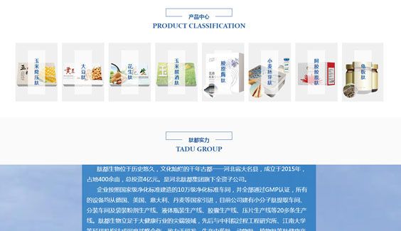 河北肽都生物科技有限公司位于歷史悠久,文化燦爛的干年古都一一河北省大名縣,成立于2015年,占地400余畝,總投資4億元。是河北肽都集團旗下全資子公司。企業(yè)按照國家級凈化標準建造的10萬級凈化標準車間,并全部通過GMP認證,所有的設備均從德國、美國、意大利、丹麥等國家引進,目前公司建有小分子肽提取車間、分裝車間及袋裝粉劑生產(chǎn)線、液體瓶裝生產(chǎn)線、膠囊生產(chǎn)線、壓片生產(chǎn)線等20多條生產(chǎn)線。肽都生物立足于大健康行業(yè)的尖端領域,先后與中科院過程工程研究所、江南大學等科研機構(gòu)達成深度戰(zhàn)略合作。致力于研發(fā)、生產(chǎn)中藥肽、動物肽、植物肽等小分子活性肽產(chǎn)品。