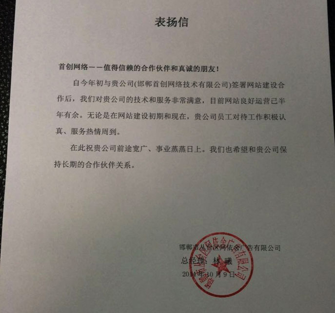 自今年初與貴公司(邯鄲首創(chuàng)網(wǎng)絡(luò)技術(shù)有限公司)簽署網(wǎng)站建設(shè)合作后,我們對(duì)貴公司的技術(shù)和服務(wù)非常滿意,目前網(wǎng)站良好運(yùn)營已半年有余。無論是在網(wǎng)站建設(shè)初期和現(xiàn)在,貴公司員工對(duì)待工作積極認(rèn)真、服務(wù)熱情周到。